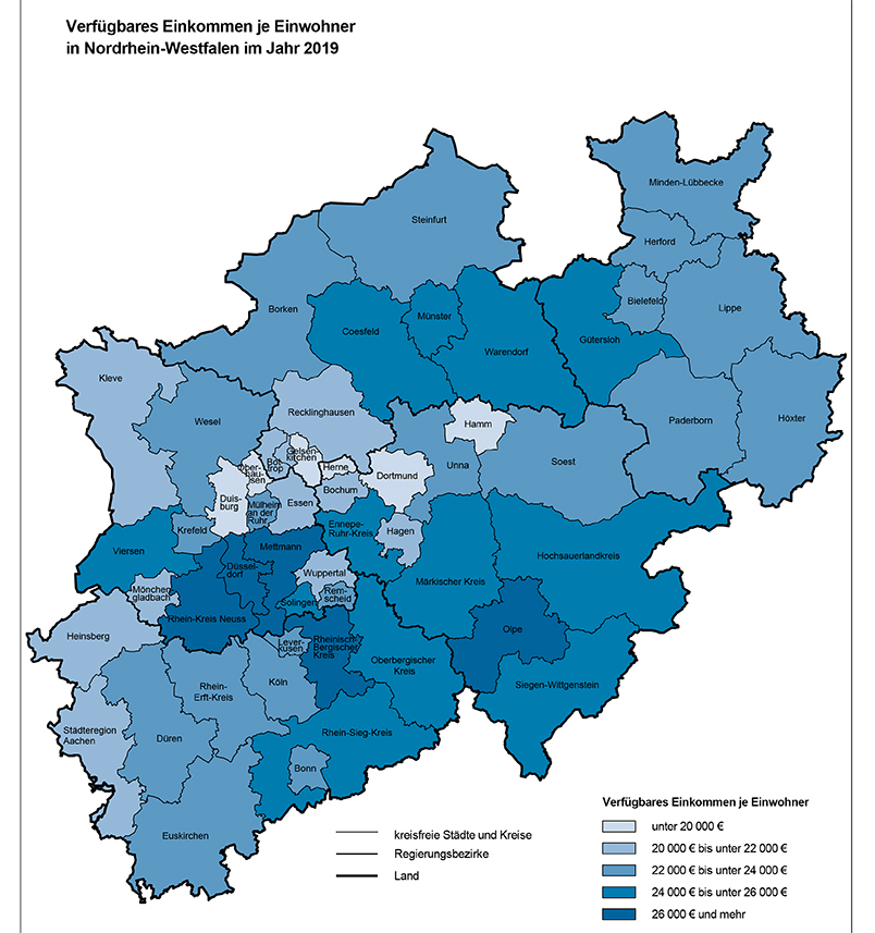 Insgesamt belief sich das verfügbare Einkommen im Jahr 2019 in Nordrhein-Westfalen auf rund 414,3 Milliarden Euro. Von allen Städten und Gemeinden des Landes wiesen die Städte Köln (25,4 Milliarden Euro) und Düsseldorf (16,9 Milliarden Euro) die höchsten Einkommenssummen auf. Rein rechnerisch kamen damit auf jeden Einwohner Kölns 23 339 Euro. In der Landeshauptstadt lag das verfügbare Einkommen bei durchschnittlich 27 199 Euro.