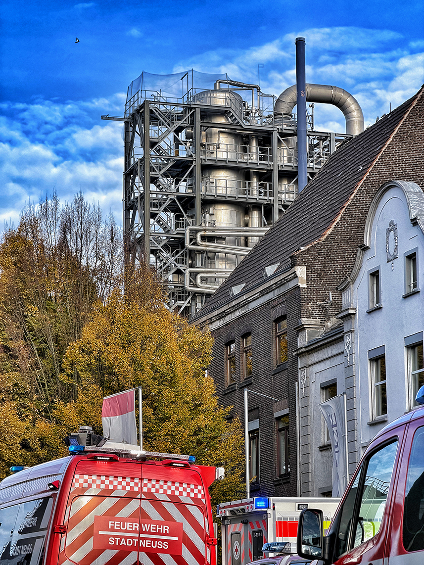 Neuss. Schwieriger Feuerwehreinsatz am Dienstagvormittag, dem 4. November. Alarm ausgelöst wurde um 09:57 Uhr zu einem Brand in einem Industriebetrieb auf der Industriestraße im Neusser Hafengebiet. In einer Produktionshalle war es zu einem Feuer im Bereich einer Maschine im dritten Obergeschoss gekommen. Bereits auf der Anfahrt war eine deutliche Rauchentwicklung sichtbar.