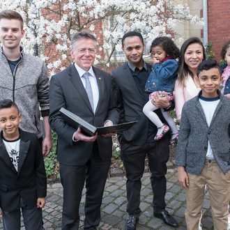 Zeremonie im Kreishaus in Grevenbroich: Landrat Hans-Jürgen Petrauschke machte Borussia Mönchengladbachs Stürmer Rafael Caetano de Auraújo und seine Familie endgültig zu deutschen Staatsbürgern. Er sagte bei der Übergabe der Urkunde: …