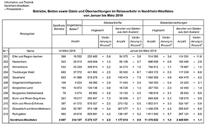 Im ersten Quartal des Jahres 2019 wurden fast 5,3 Mio. Ankünfte in 5 080 nordrhein-westfälischen Beherbergungsbetriebe (mit mindestens zehn Gästebetten und auf Campingplätzen) gezählten; daraus entstanden 11,5 Mio. Übernachtungen. Wie das Statistische Landesamt …