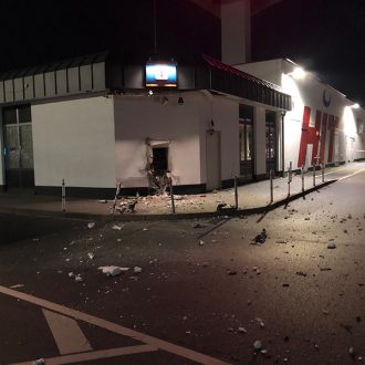 Erheblicher Sachschaden ist in der Nacht von Freitag auf Samstag (03.07.21) entstanden, als um 02:43 Uhr mehrere Detonationen erfolgten, die einem Geldautomaten einer VR-Bank in Dormagen-Horrem galten, wie das Polizeifoto …