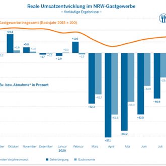 Die Umsätze im nordrhein-westfälischen Gastgewerbe waren im August 2020 real – also unter Berücksichtigung der Preisentwicklung – um 26,3 Prozent niedriger als im entsprechenden Vorjahresmonat. Wie Information und Technik Nordrhein-Westfalen als Statistisches …