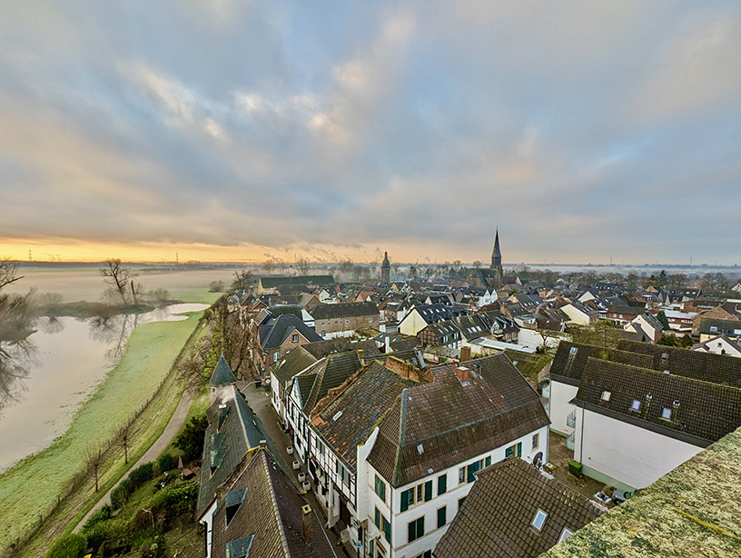 Die Aussicht vom Rheinturm, Foto Pressestelle der Stadt Dormagen, daher stammt auch das Beitragsfoto, das die sanierte Raphaelskapele zeigt