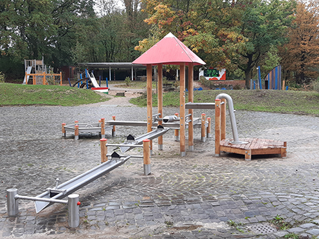 In Abstimmung mit dem Gesundheitsamt wurde nach einer Möglichkeit des Wasserspiels gesucht, die trotz der Gänsepopulation möglich ist. Die inzwischen montierte neue Spielanlage ermöglicht ein attraktives Spiel mit dem Element Wasser. Über diverse Rinnen, Überläufe, Sperren und Abläufe können viele Kinder zeitgleich an der neuen Anlage das Element Wasser erleben. Ein Turm mit rotem Dach markiert die Wasserstelle. Die Montage erfolgte im September und Oktober diesen Jahres und konnte so noch rechtzeitig in den Herbstferien inbetrieb genommen werdenund bleibt bis zun Einsetzen von winterlichen Temperaturen bespielbar von Kindern
